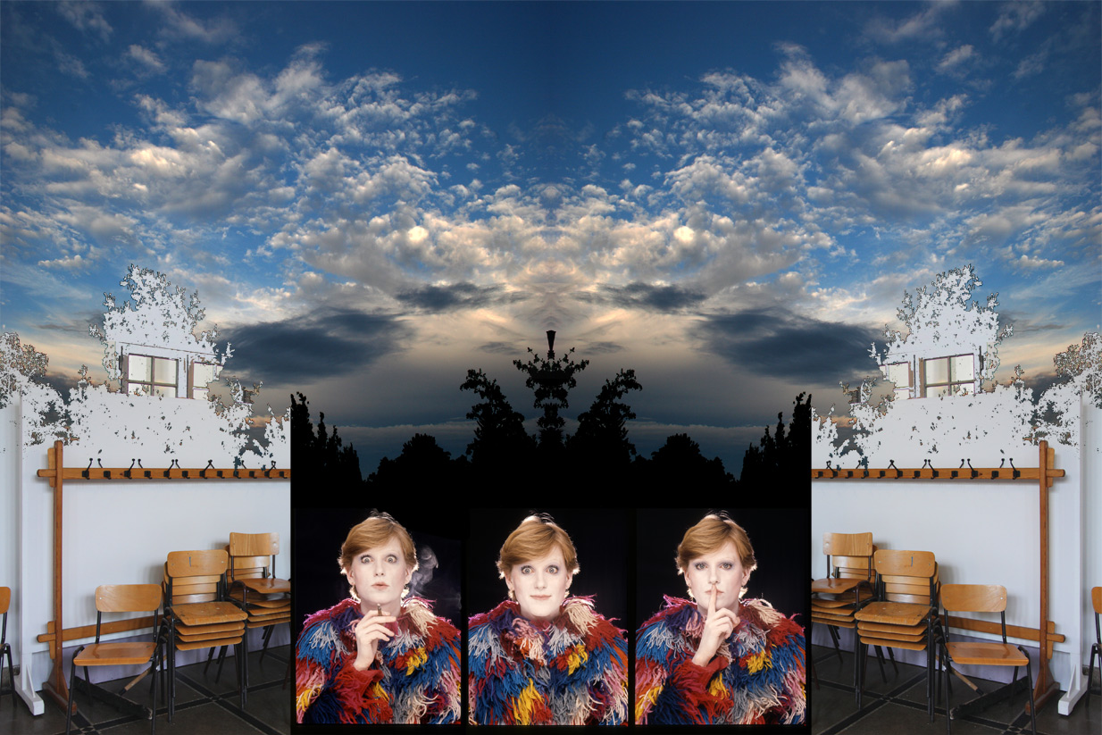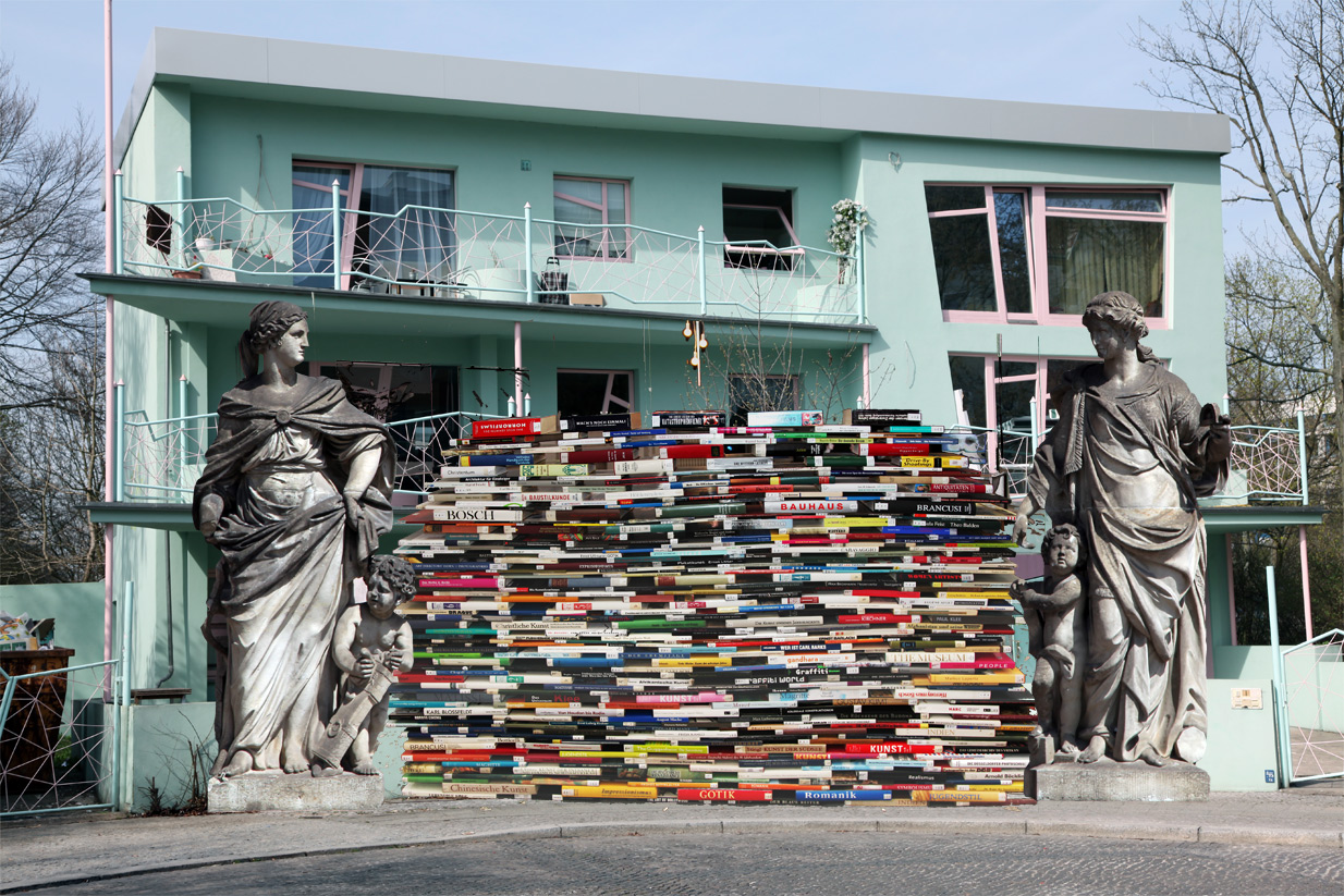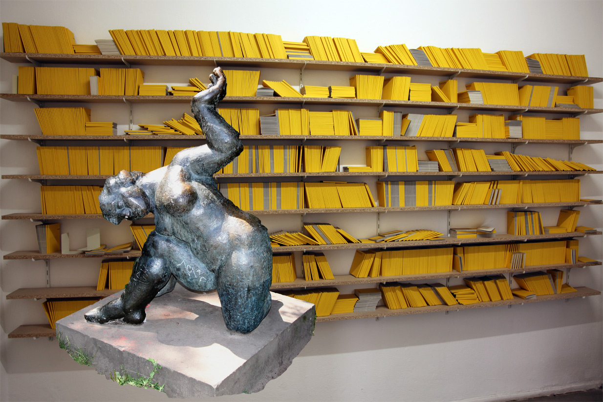 Ich richte hier im Gebäude Eiswerder 23 ein Atelier ein. Im 5 m hohen Raum sockeln Bücherregal und Schultafel einen Bilderfries h-2m, b-10m, es ist eine Wunderkammer und ein Raum zum bildnerischen Arbeiten gleichermaßen. Offen ineinander übergehend ein Fotostudio, ein Galerieraum mit Bar, eine Computer-Empore und eine Teeküche sowie einen Schlafplatz. Als SelbstSammler (meiner eigenen Kunst u.a.), kann ich dann im selbst-Museum arbeiten und das zeigen, was mich als Künstler ausmacht. Eben das unabgeschlossene, nicht ausgestellte Werk eines konzeptionellen unvollendeten Künstlers".